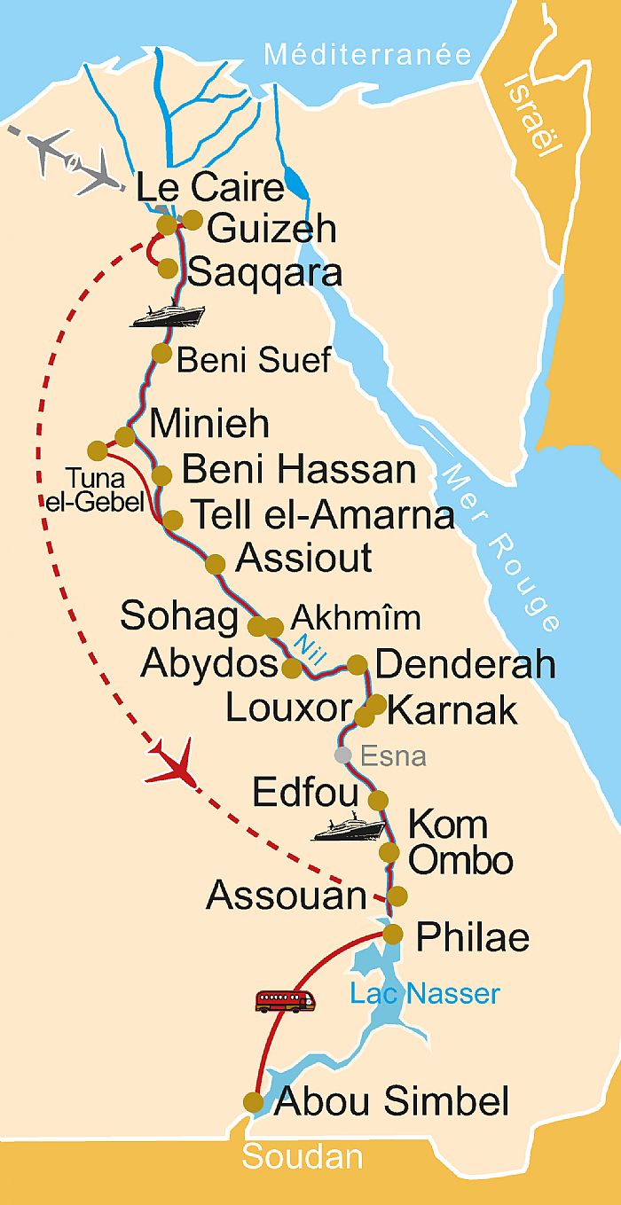 Cette croisière exceptionnelle vous entraîne à la découverte des sites majeurs de Basse, de Moyenne et de Haute-Egypte. De la bruissante capitale cairote, qui vous dévoilera ses charmes millénaires, vous naviguerez au rythme du Nil jusqu'à Assouan, au pied de la première cataracte. C'est la manière la plus confortable de découvrir le cortège de sites prestigieux de la moyenne Egypte, enfin à nouveau accessible aux voyageurs passionnés. Les gigantesques nécropoles de Beni Hassan et de Tuna el-Gebel vous conduiront aux frontières du monde des morts, dans ces tombes dont les reliefs et les couleurs restituent avec un si grand réalisme la vie quotidienne des anciens égyptiens. Ces deux sites seront un excellent préambule au clou de notre périple, Tell el-Amarna, concrétisation dans la pierre du « rêve » d’Aménophis IV Akhenaton. Abydos et Dendérah, Edfou et les temples rupestres d'Abou Simbel compléteront magnifiquement ce parcours, qui abordera aussi l'histoire chrétienne de l'Egypte avec les monuments coptes. lire moins