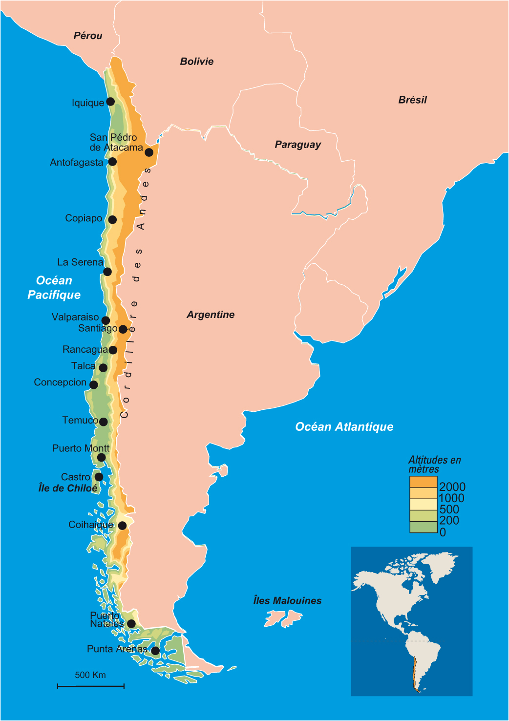 Plus de 4 000 km du nord au sud pour une largeur moyenne de 200 km, le Chili se calque sur le versant occidental de la cordillère des Andes entre 18° et 56° de latitude sud, recoupant ainsi des zones climatiques extrêmement variées, du désertique tropical à l’océanique austral. Le Chili offre au voyageur une extraordinaire variété de paysages, du désert d’Atacama aux glaciers de Patagonie, de la Terre de Feu à l’île de Pâques.