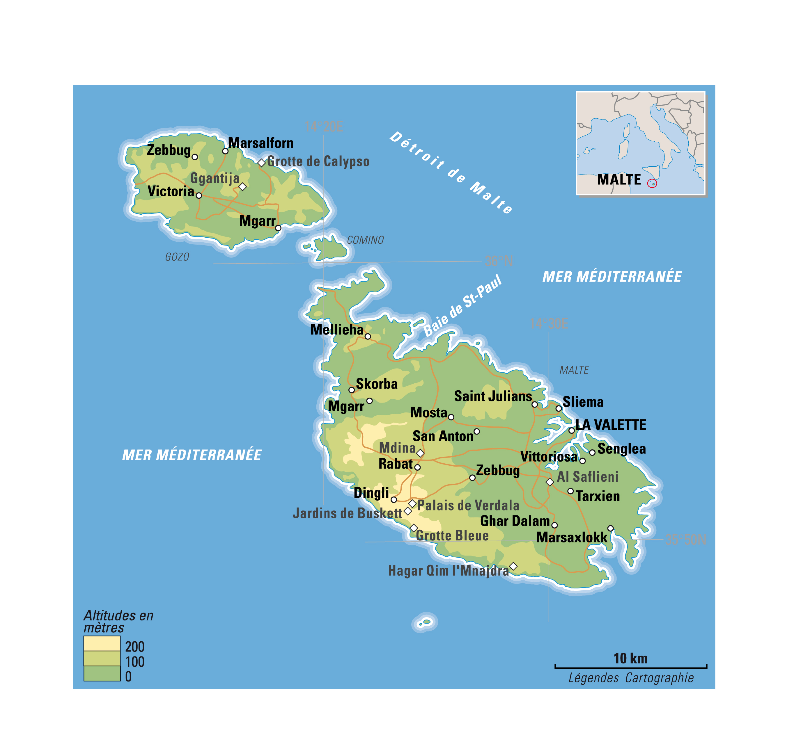 Situé à 35°53' de latitude nord et à 14°30' de longitude est, l’archipel maltais – qui comprend les îles de Malte (247 km2) et de Gozo (68 km2) ainsi que les petits îlots de Comino, Cominot...