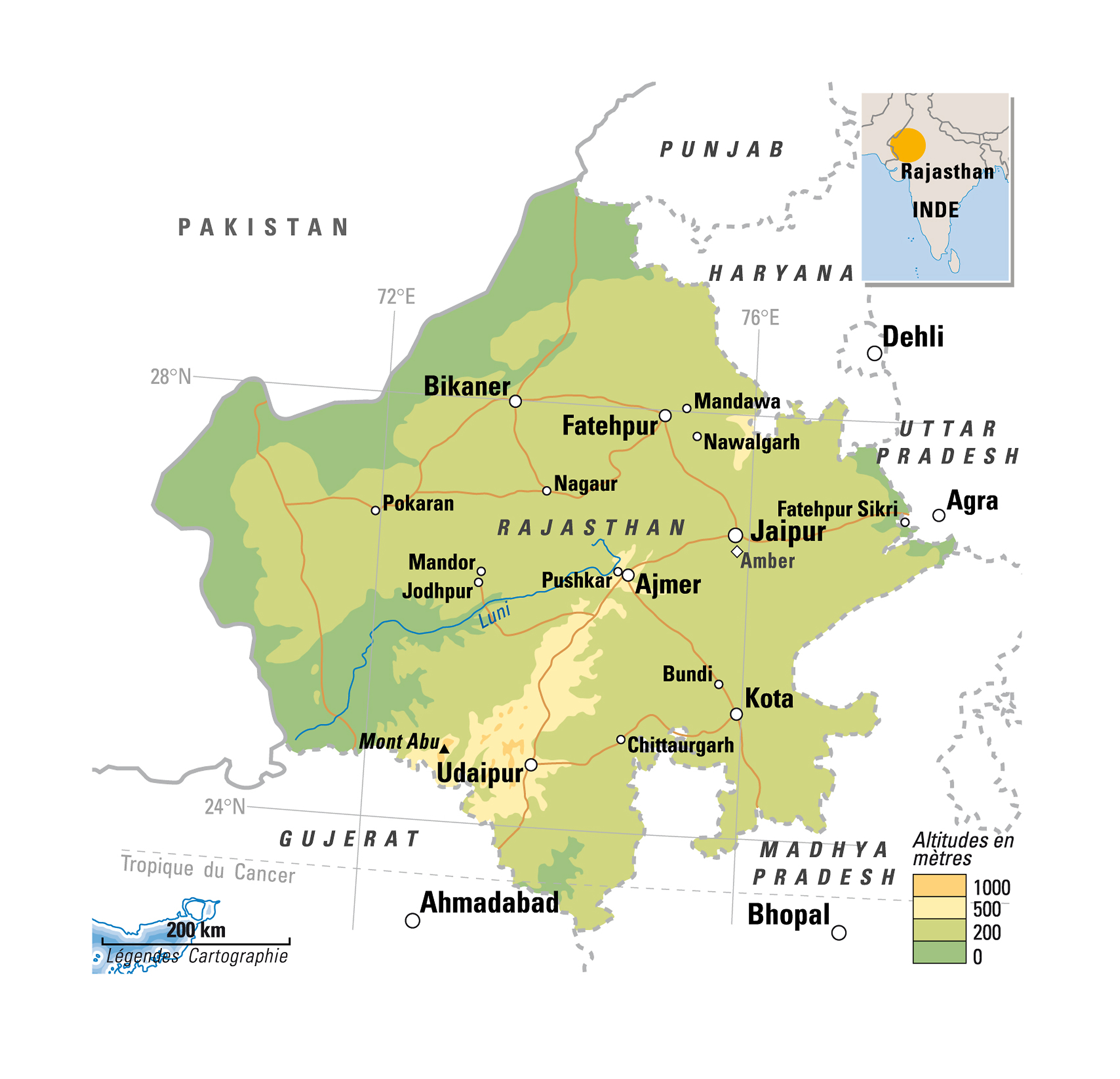 Entre le désert de Thar, le bassin du Gange et les steppes du Punjab, le Rajasthan est une province romantique : ses châteaux et citadelles évoquent tout un passé de féodalité, au sens où nous l’entendons en Europe, mais, ici, chevaliers ou guerriers sont des kshatriya, groupés en clans qui se font et se défont autour de quelques puissantes familles ; ces clans, aux origines mystérieuses, prétendent descendre du Soleil, de la Lune et du Feu… Aujourd’hui cet État, peuplé en grande majorité d’hindous, est l’un des plus fascinants de l’Inde. Ses châteaux sont semblables aux palais où vivaient des princes raffinés dont la vie de cour et les guerres furent illustrées dans d’innombrables miniatures – art où excellèrent les écoles rajpoutes. Autre source d’étonnement : l’architecture des temples hindous, mais aussi l’extraordinaire présence humaine du peuple rajpoute, au type physique plein de noblesse ; les femmes portent encore, jusque dans les campagnes les plus reculées, d’étonnants costumes et de surprenants bijoux d’argent et d’ivoire. lire moins
